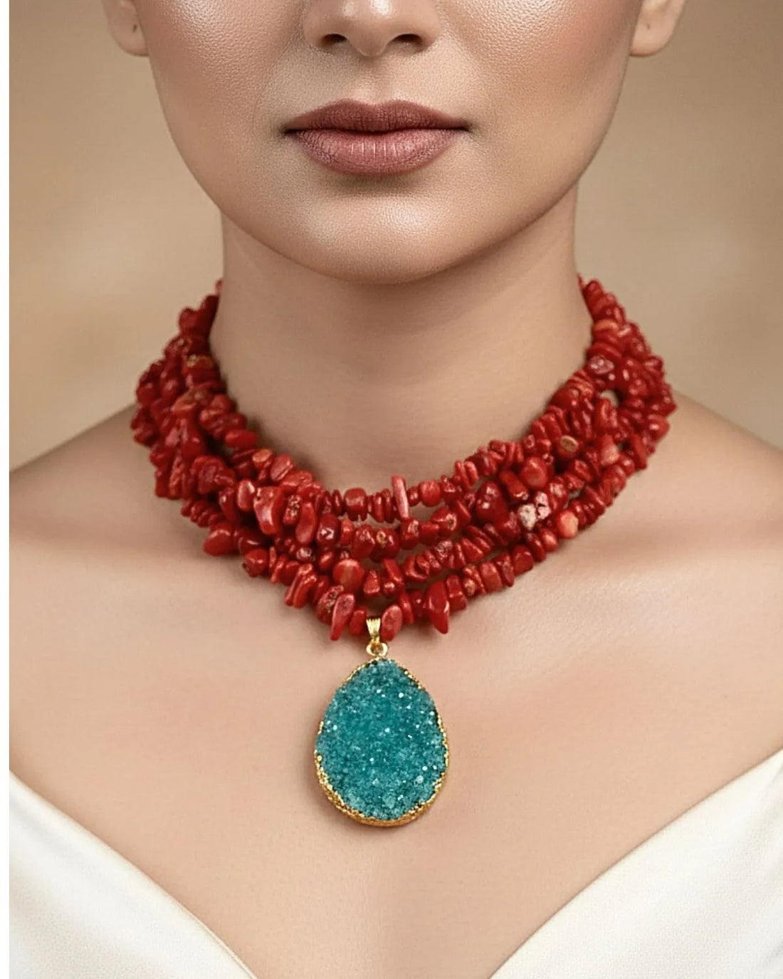 Bold. Artistic. Unapologetically unique.This handcrafted statement necklace features raw, uncut coral stones layered into rich...