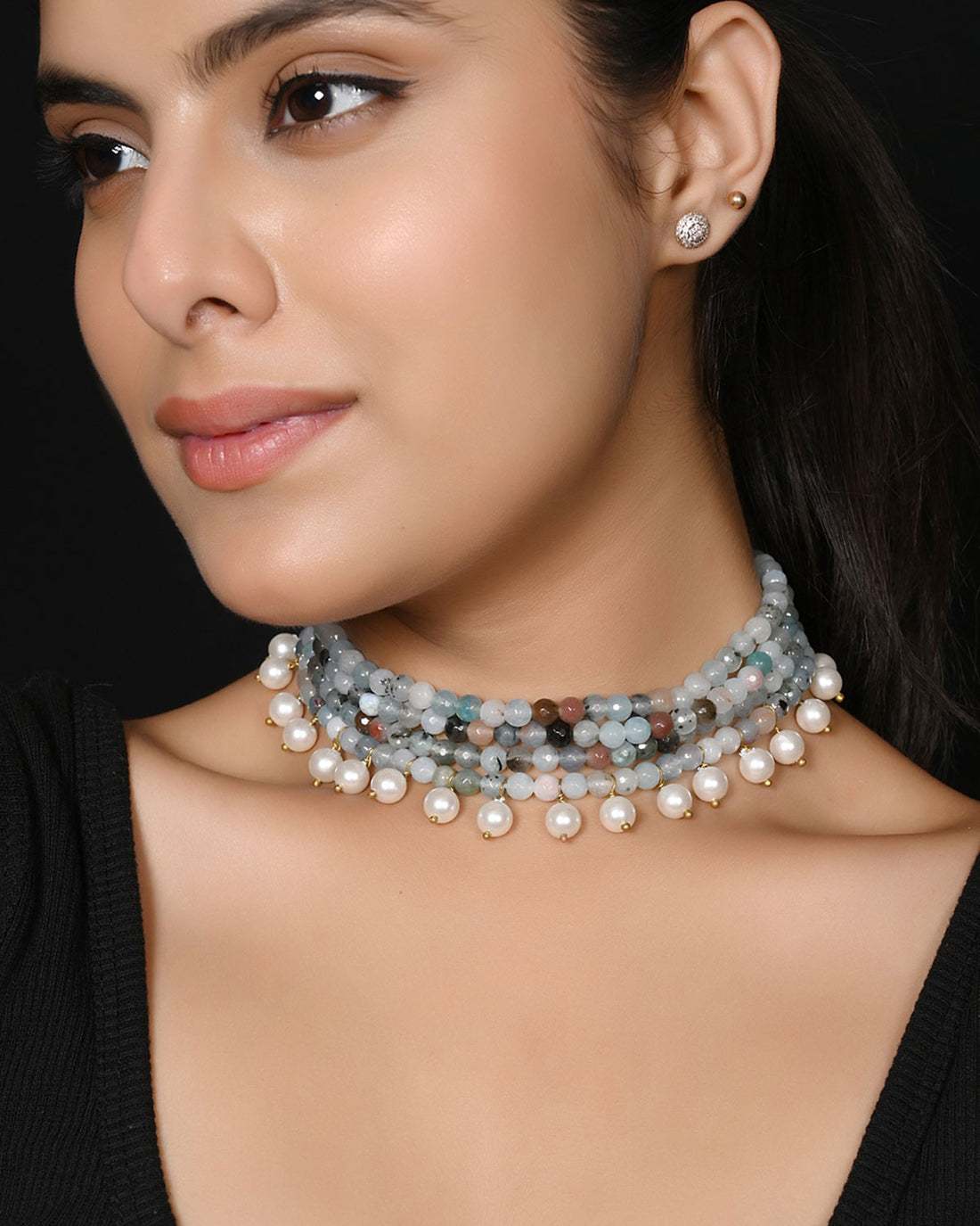 Blue Bloom Choker Necklace with Onyx Stones and Shell Pearls
