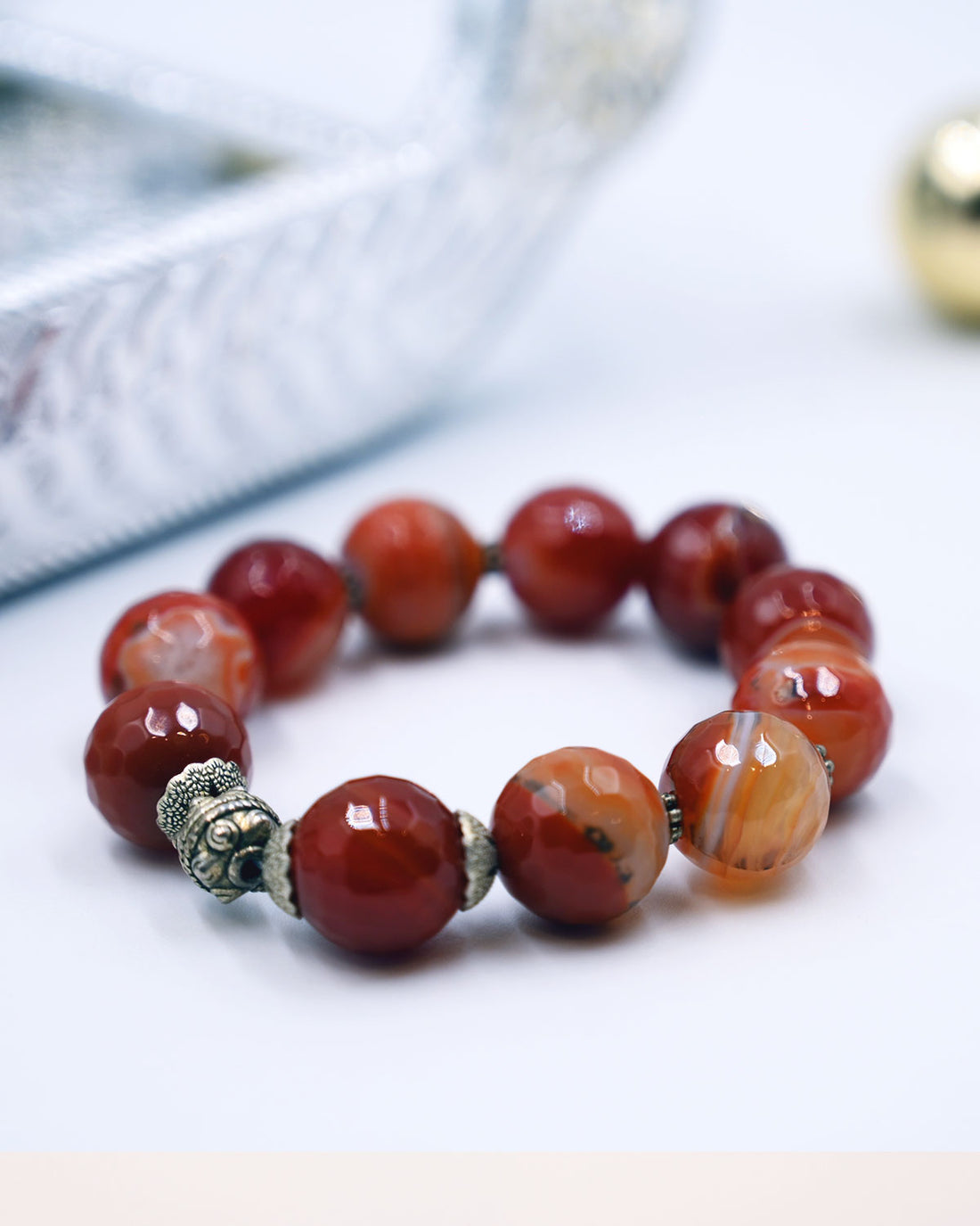 12 MM Agate round faceted stones in the shades of Brown. This bracelet is adorned...