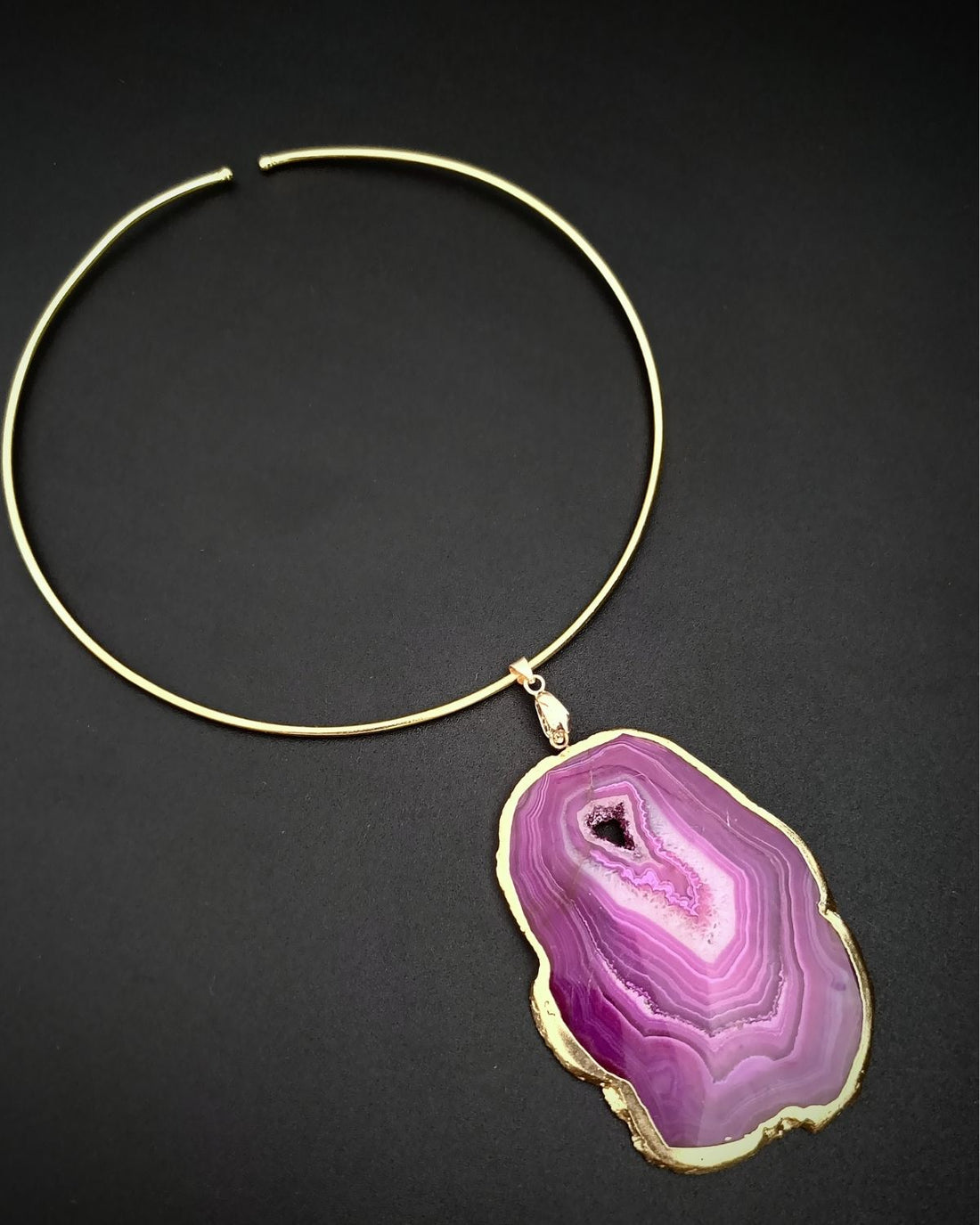Magenta Agate Slice Stone & Brass Hasli- Each piece features a unique, raw-edged agate slice...