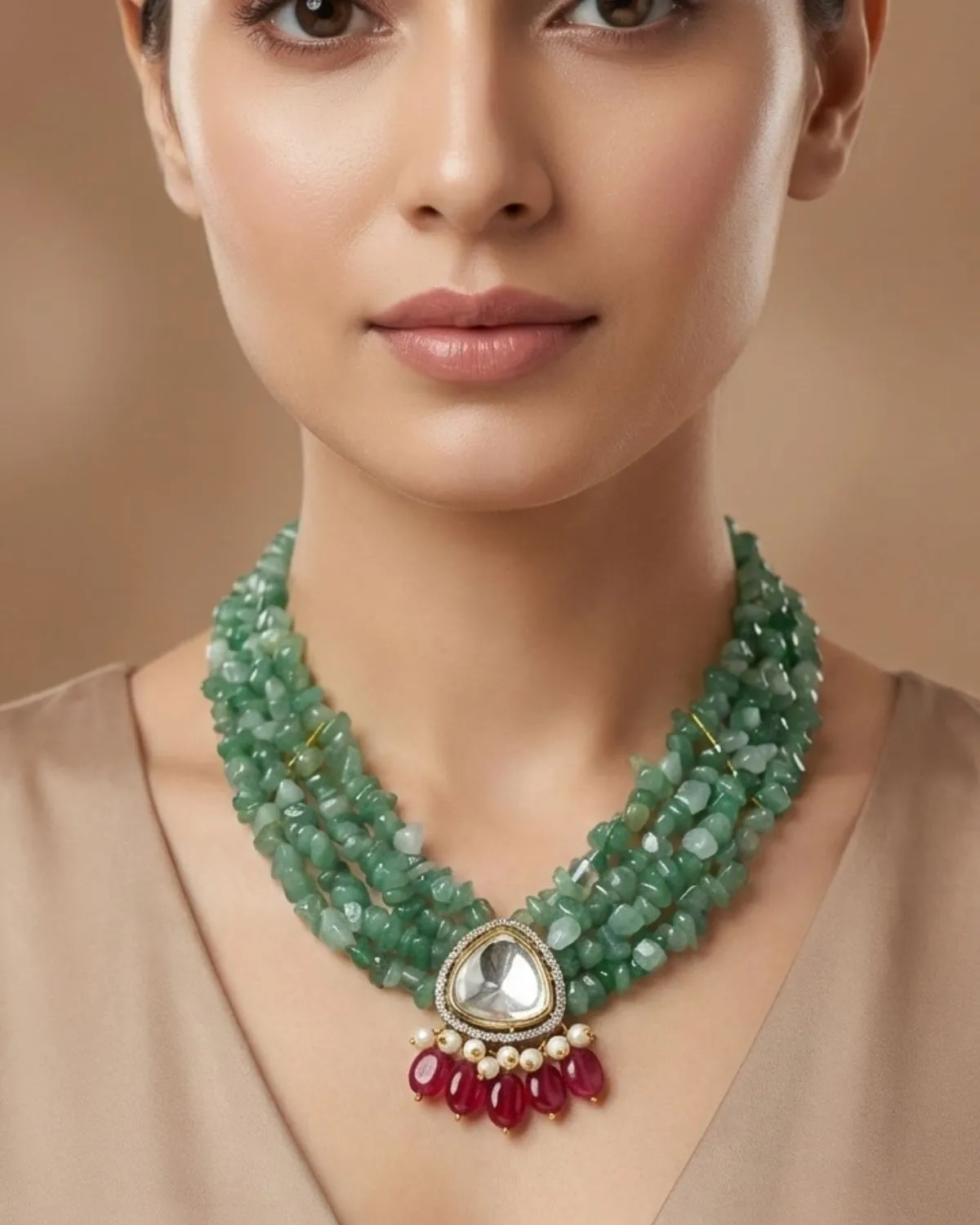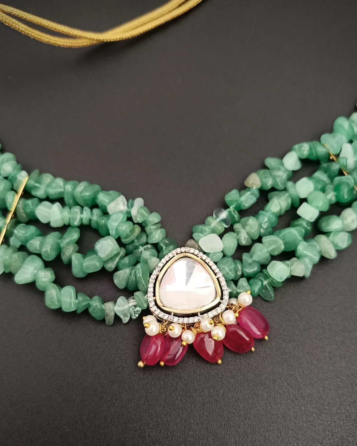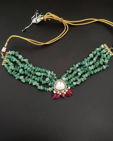 Layers of uncut Green Aventurine stones form a rich textured necklace that feels earthy, vibrant, and elegant all at once. At the center sits a traditional Kundan centerpiece, adding a touch of heritage artistry and regal charm.