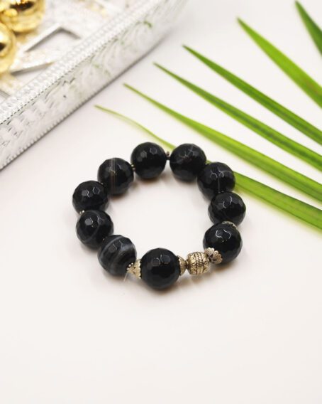16 mm Agate round faceted stones in the shades of Black. Adorned with ani Tarnish Bead Caps and componants.