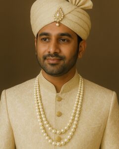 The mix of pearl sizes creates a bold, elegant look that makes any groom stand out. Whether you’re walking down the aisle or celebrating at your reception, this groom’s pearl necklace is all about heritage, luxury, and timeless style.