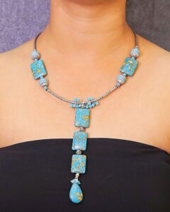 This Howlite Turquoise Necklace, accented with sleek German Silver tubes, is a unique statement piece that effortlessly complements any ensemble. The striking blue hues of Howlite Turquoise bring a touch of elegance, while the silver accents add a modern edge. Lightweight and versatile, this handcrafted necklace is perfect for both casual and formal looks, making it a must-have addition to your jewelry collection.