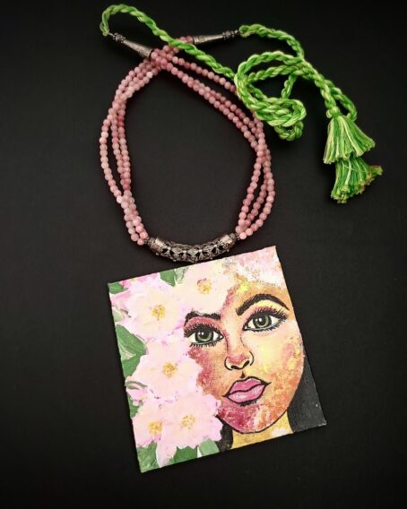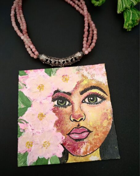 The Sab Rang – Girl with Flower Hand-Painted Necklace is a true piece of wearable art. Crafted on a 4×4 inch canvas using acrylic colours, the pendant captures the graceful image of a girl with a flower, making it a rare and expressive accessory. The necklace is beautifully strung with 4 mm jade stones, known for their calming and balancing energies, adding a natural elegance to the design.