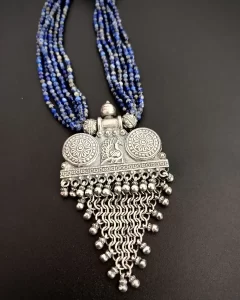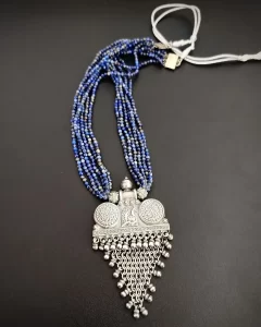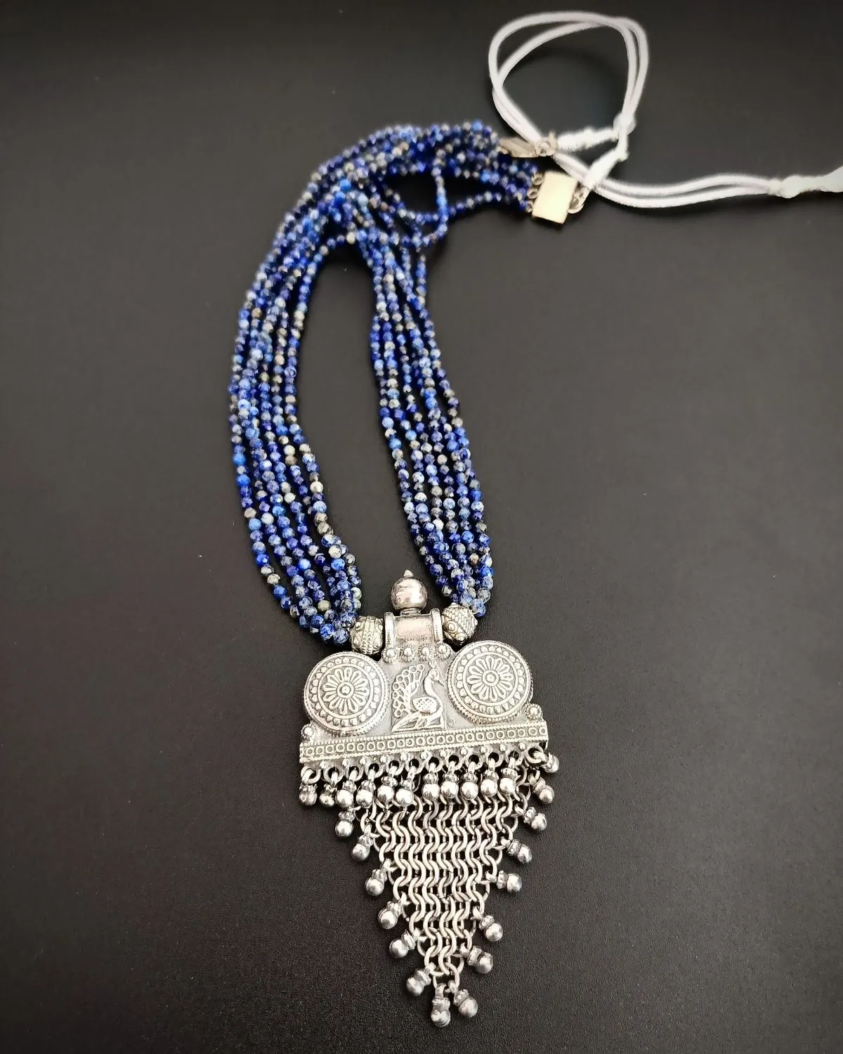 Sterling Sky Necklace – Lapis Lazuli Stones & Sterling Silver Pendant Sterling Sky Necklace is a stunning union of deep blue lapis lazuli stones and a finely crafted sterling silver pendant, creating a piece that radiates elegance and strength. Featuring delicate 3mm lapis lazuli stones in graceful multi-strands, this handmade gemstone jewellery captures the beauty of a starry night sky.