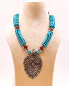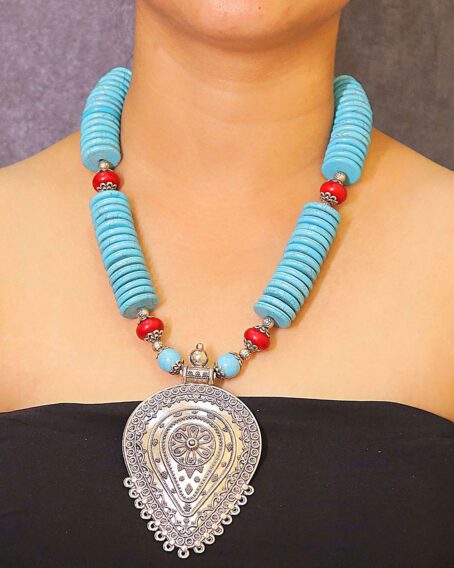 This handmade Howlite Turquoise and Coral Stone Necklace adjustable dori features a stunning German Silver pendant, blending vibrant hues with antique elegance. The cool blue of Howlite Turquoise beads contrasts beautifully with the warm tones of natural coral stones, creating a bold yet balanced design. The intricately detailed German Silver pendant adds a touch of vintage charm, making this necklace perfect for both casual and festive wear. Lightweight and versatile, it’s an ideal statement piece for those who love handmade gemstone jewelry, boho-chic accessories, and ethnic silver jewelry.