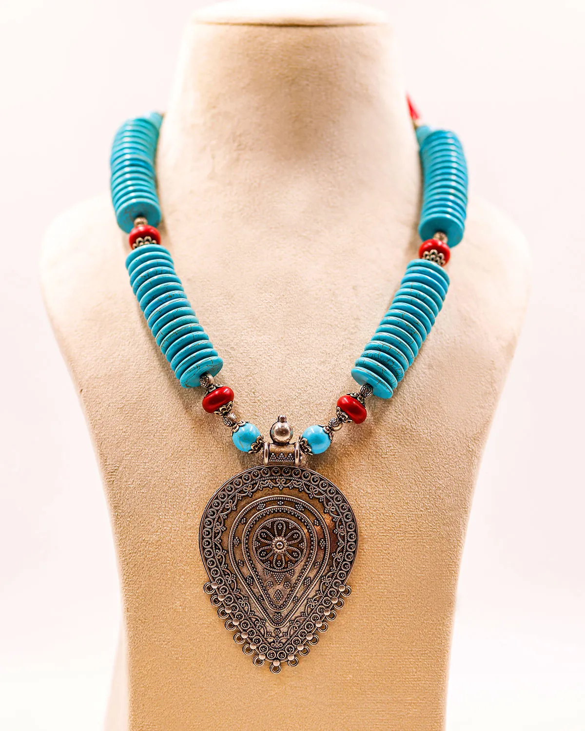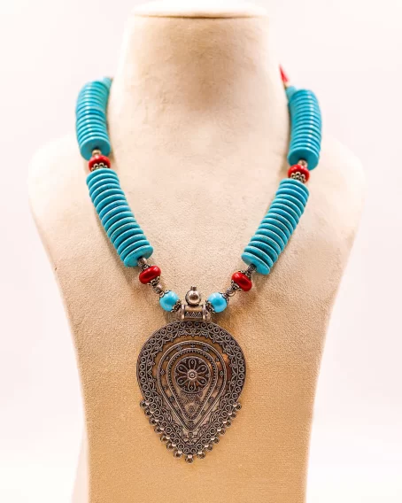 This handmade Howlite Turquoise and Coral Stone Necklace adjustable dori features a stunning German Silver pendant, blending vibrant hues with antique elegance. The cool blue of Howlite Turquoise beads contrasts beautifully with the warm tones of natural coral stones, creating a bold yet balanced design.