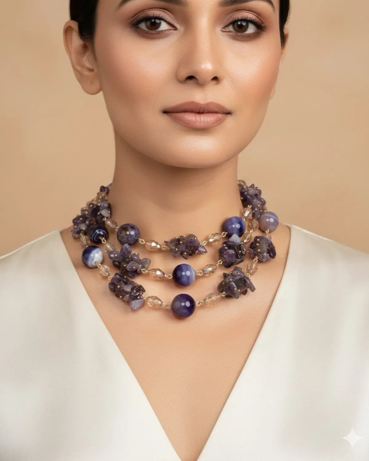 Crafted with raw uncut Amethyst and bold 16 mm faceted agate beads, this long handcrafted necklace captures the warmth of the earth and the grounding beauty of natural stones. The perfect blend of rustic charm and modern elegance, it can be styled in single, double, or triple layers for versatile looks — from minimal chic to statement glam.