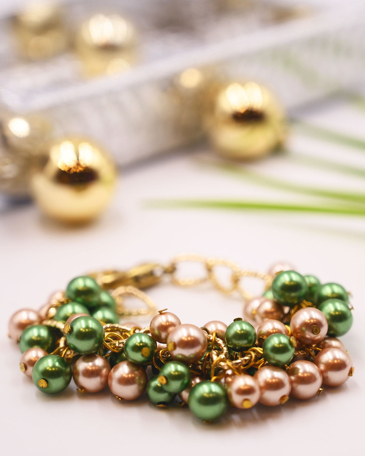 8mm and 10 mm Lustrous Shell Pearls in the shades of Green and Golden with anti-tarnish chain and brass lobster clasp.